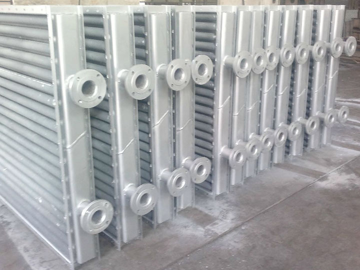 翅片式換熱器主要用于干燥系統(tǒng)中空氣加熱,是熱風(fēng)裝置中的主要設(shè)備,散熱器采用的熱介質(zhì)可以是蒸汽或熱水,也可用導(dǎo)熱油,蒸氣的工作壓力一般不超過0.8Mpa,熱空氣的溫度在150℃以下。