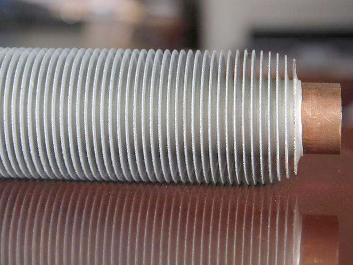 雙金屬復(fù)合翅片管是銅、鋁管(或鋼管、鋁管;或不銹鋼管、鋁管)經(jīng)復(fù)全后再軋制出翅片,具有結(jié)合緊密、熱阻小、傳熱性能好、強(qiáng)度高、流動損失小、防腐蝕性能強(qiáng)、在長期冷熱工況下不晚變形、工作壽命長等優(yōu)點。